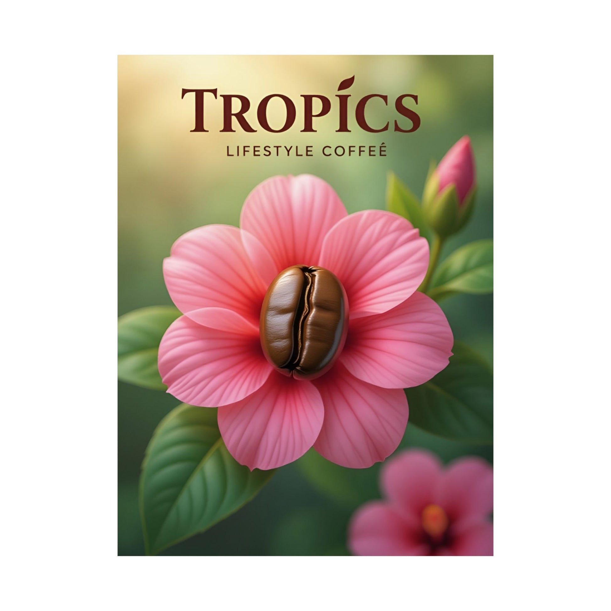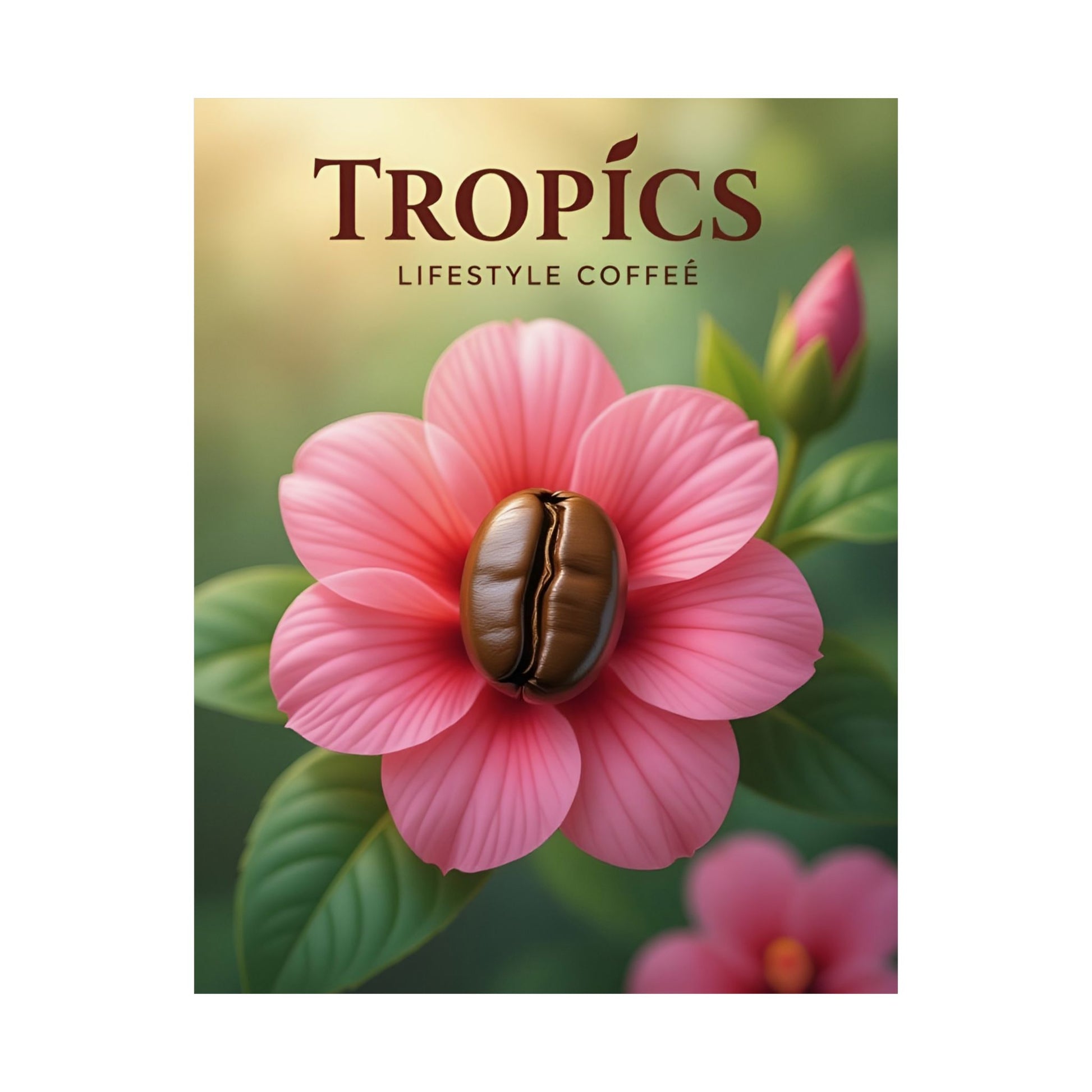 This matte vertical poster brings a quiet, sun-warmed moment of tropics and coffee into any indoor space. Soft, painterly greens fade into golden light behind a delicate pink bloom whose center is a glossy coffee bean — a gentle, unexpected pairing that speaks to mornings slow enough to savor. The matte surface softens reflections and gives the image a refined, gallery-like presence on archival paper that holds color and detail for years. Hang it in a kitchen nook, coffee bar, or office wall to invite a calm, sensory pause into everyday routines.