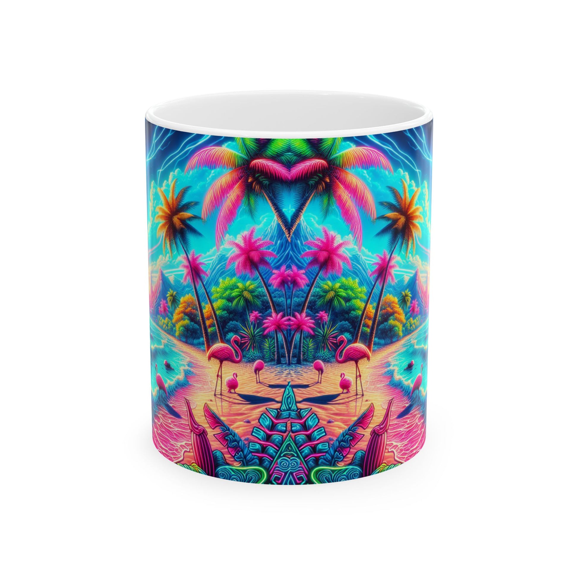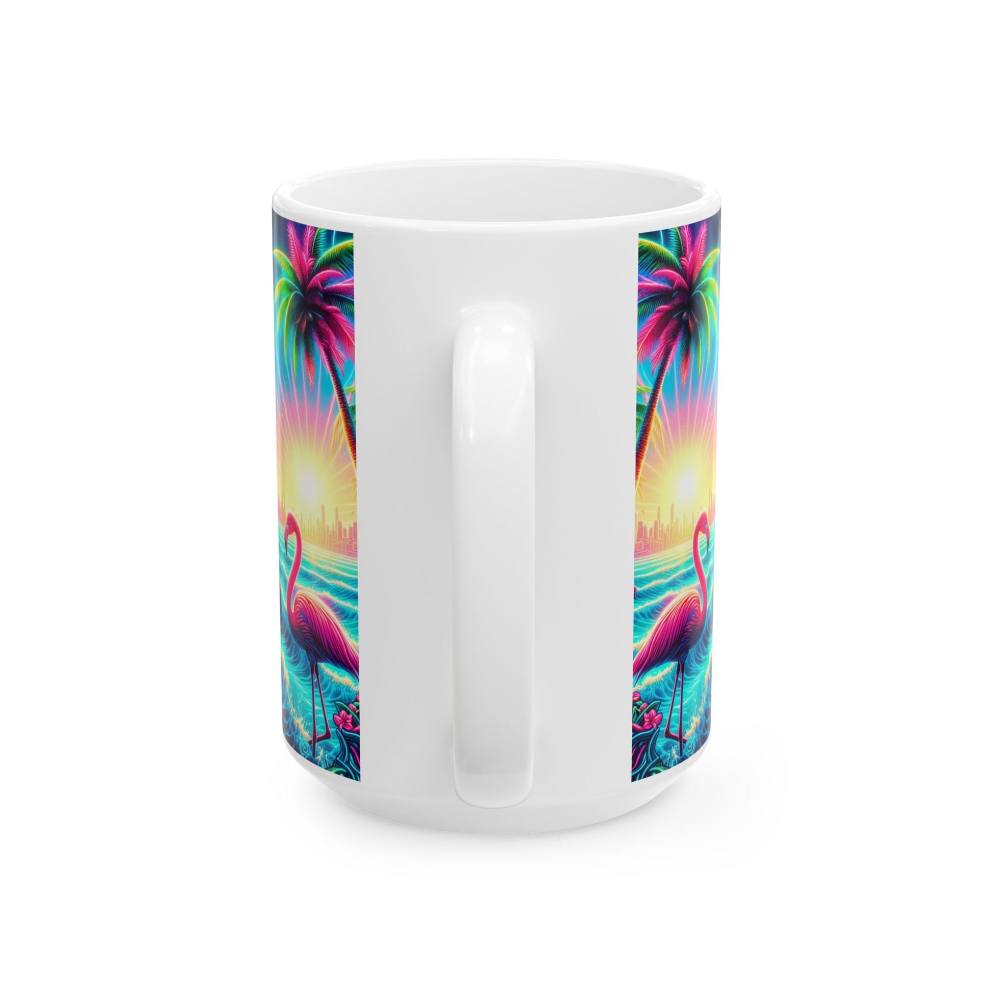 Ceramic White Mug - 11oz & 15oz, / Pop Art Flamingo Beach