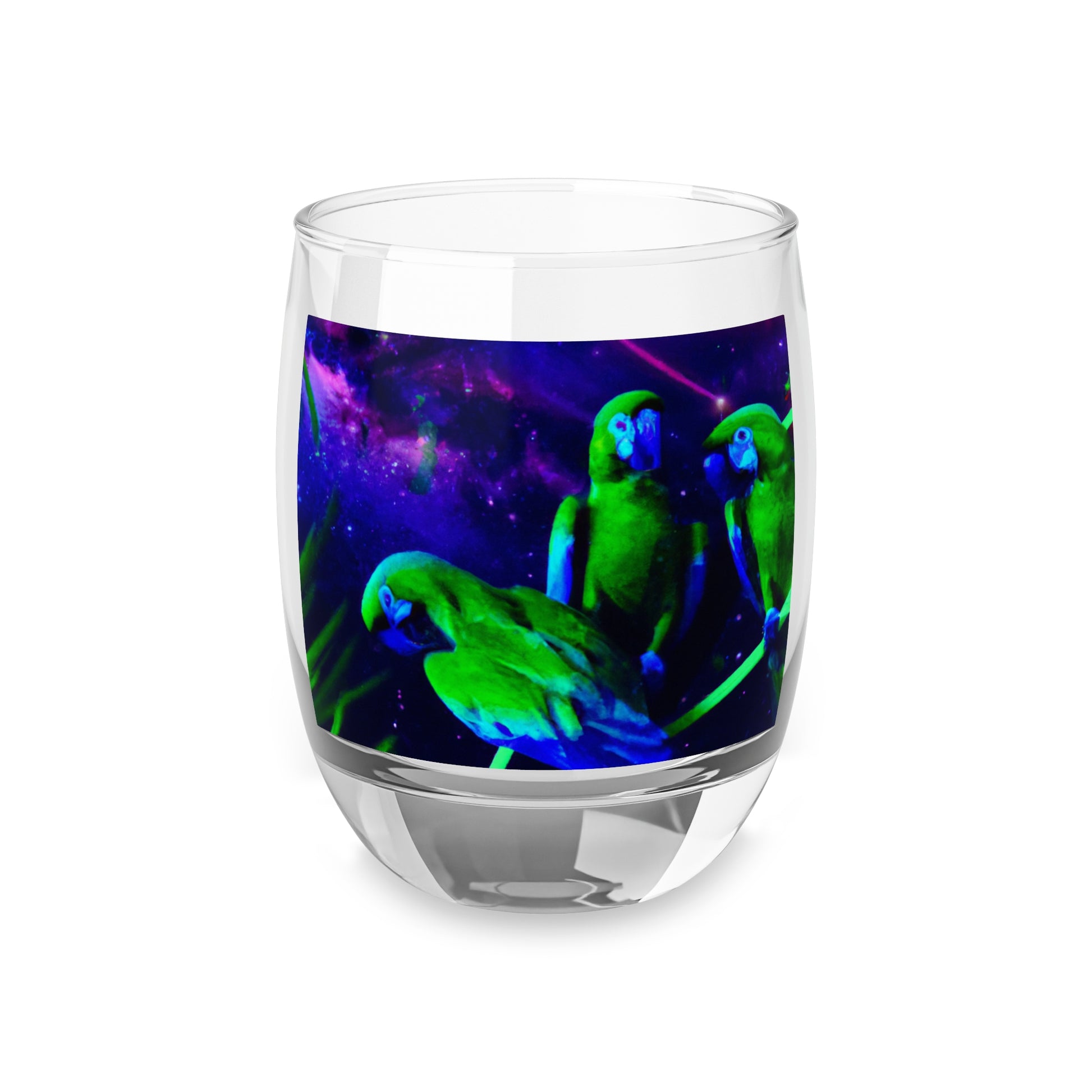 These whiskey glasses come in one size: 6oz (0.17l), which fits into the whiskey-glass standard in hospitality. Neon parrots. Functional art.