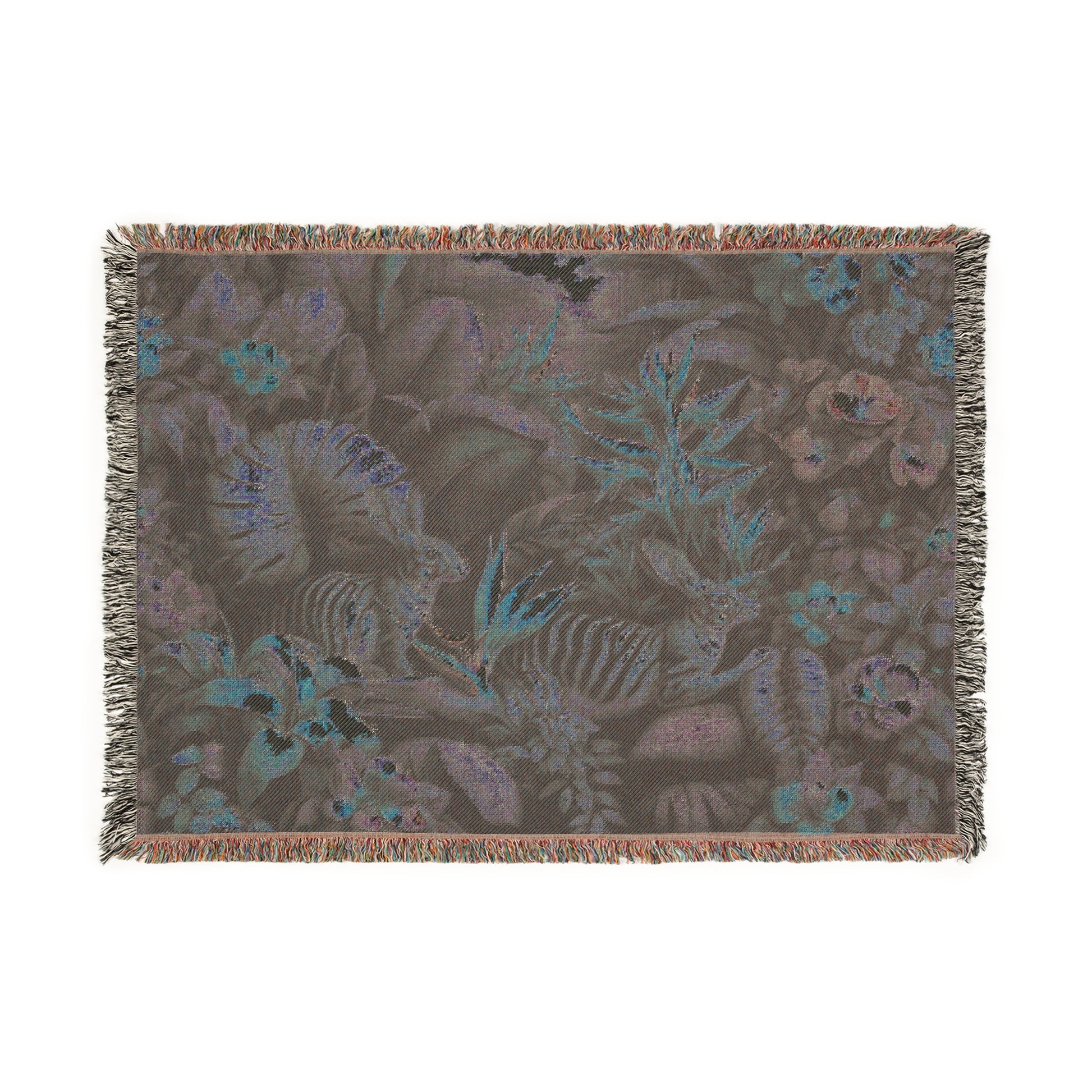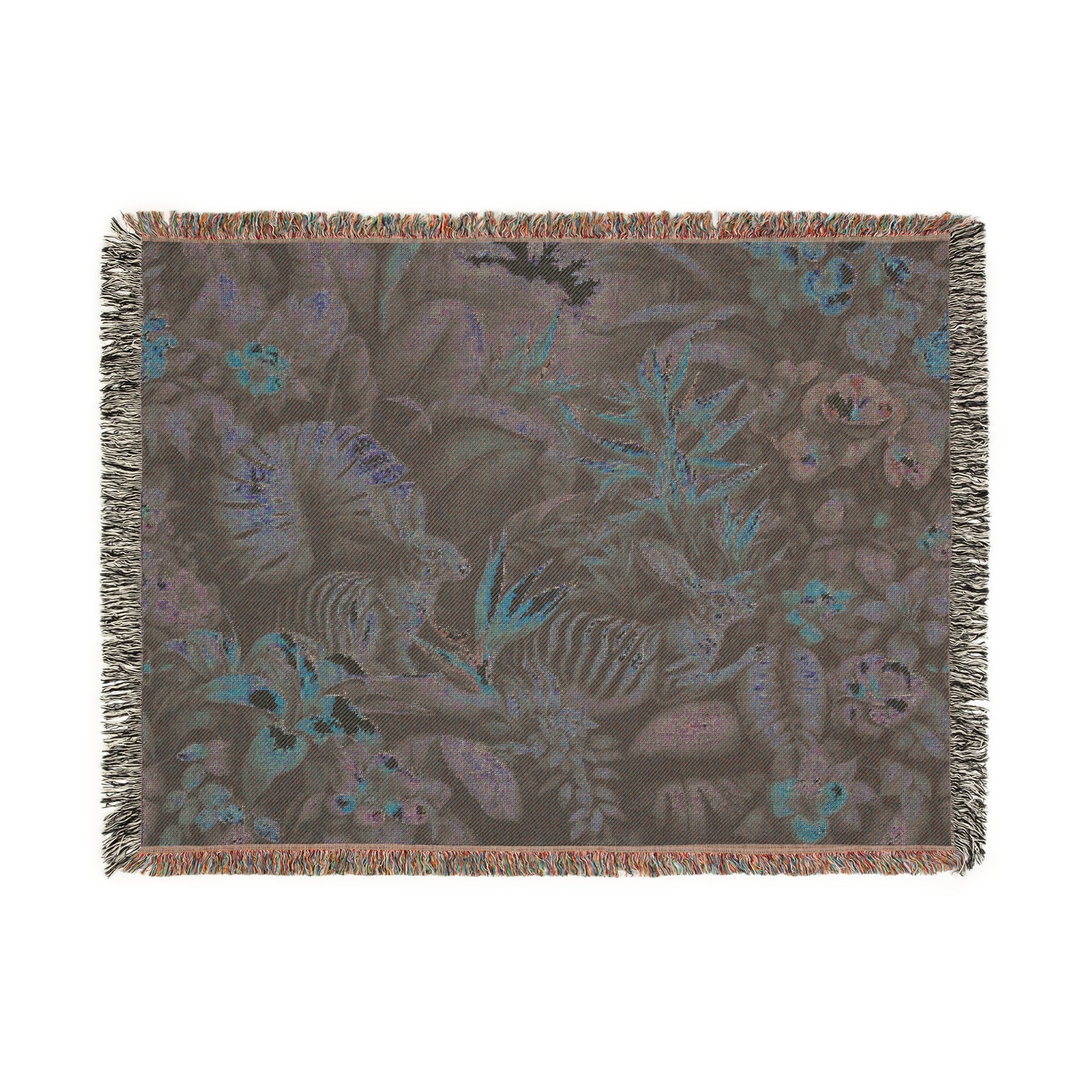 Introducing our stunning florala and fauna woven blanket, with tropical vibes, designed to add warmth and charm to any space with design for tropical homes of two striped Sumatran rabbits hopping around the rainforest full of blooms. This blanket exudes a cozy, inviting atmosphere, making it perfect for snuggling up on chilly nights or adding a decorative touch to your living room. Whether draped over a sofa or laid across the foot of your bed, its vibrant patterns and colorful fringed edges bring a delightful energy to your home decor. Ideal for anyone who appreciates craftsmanship and style, this woven blanket makes a thoughtful gift.