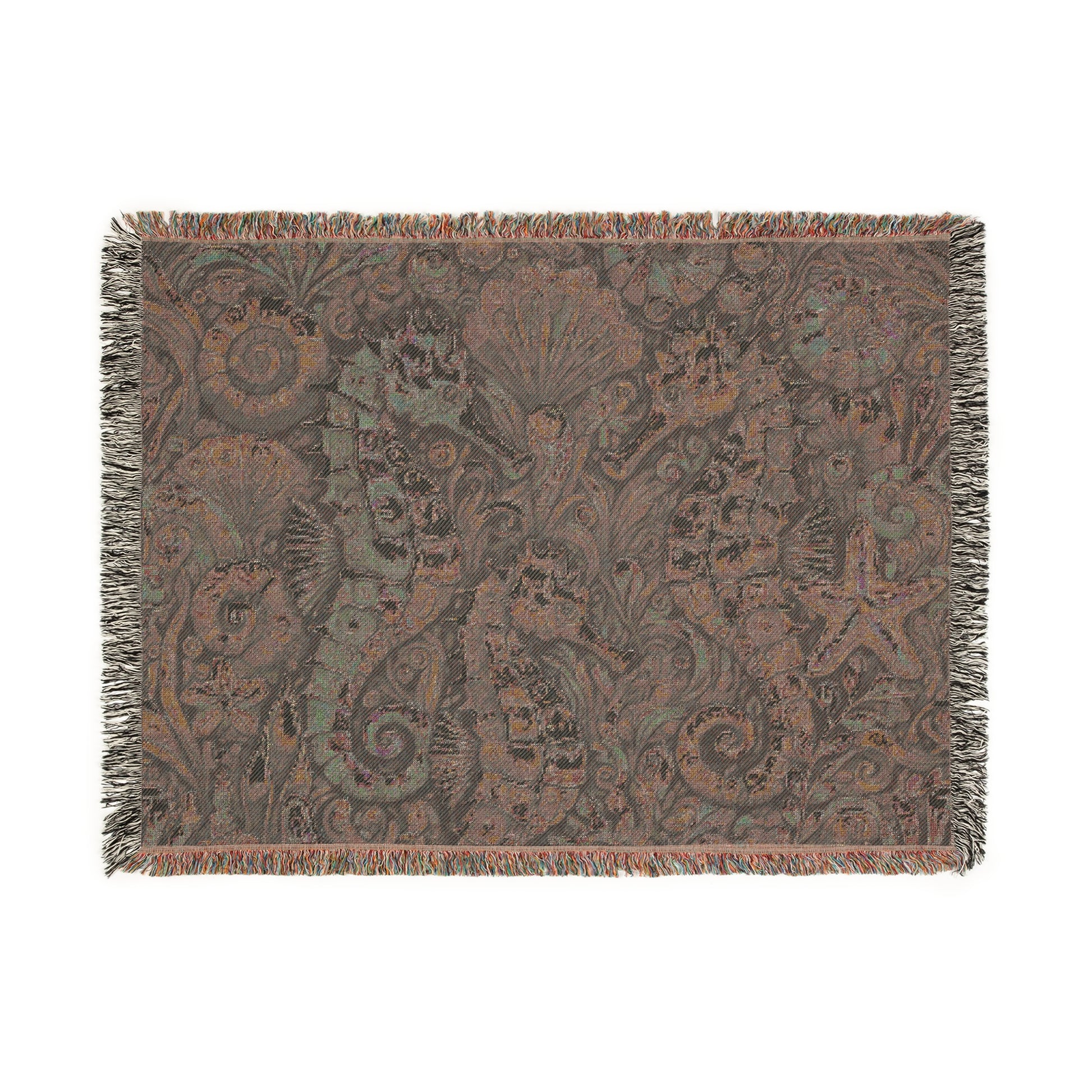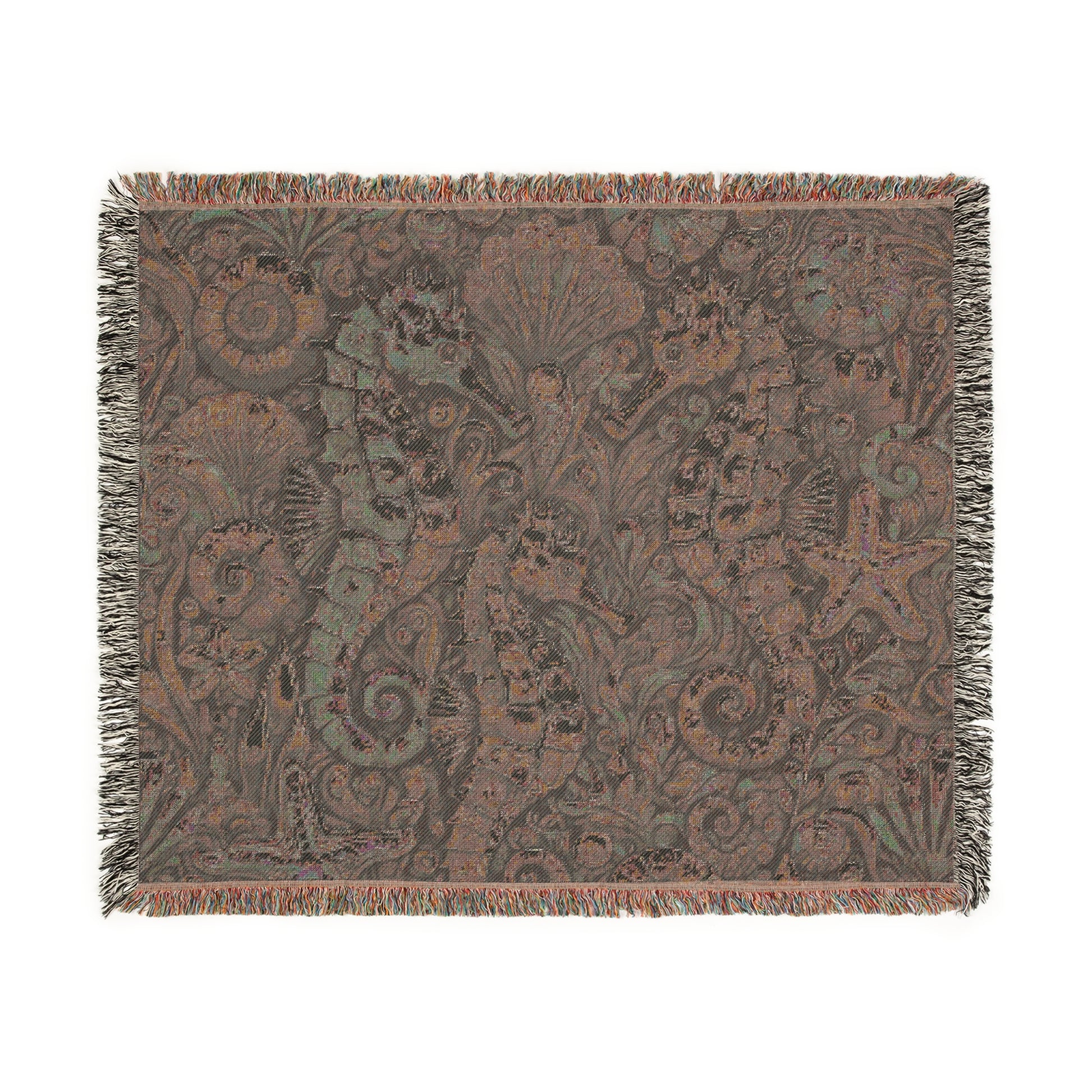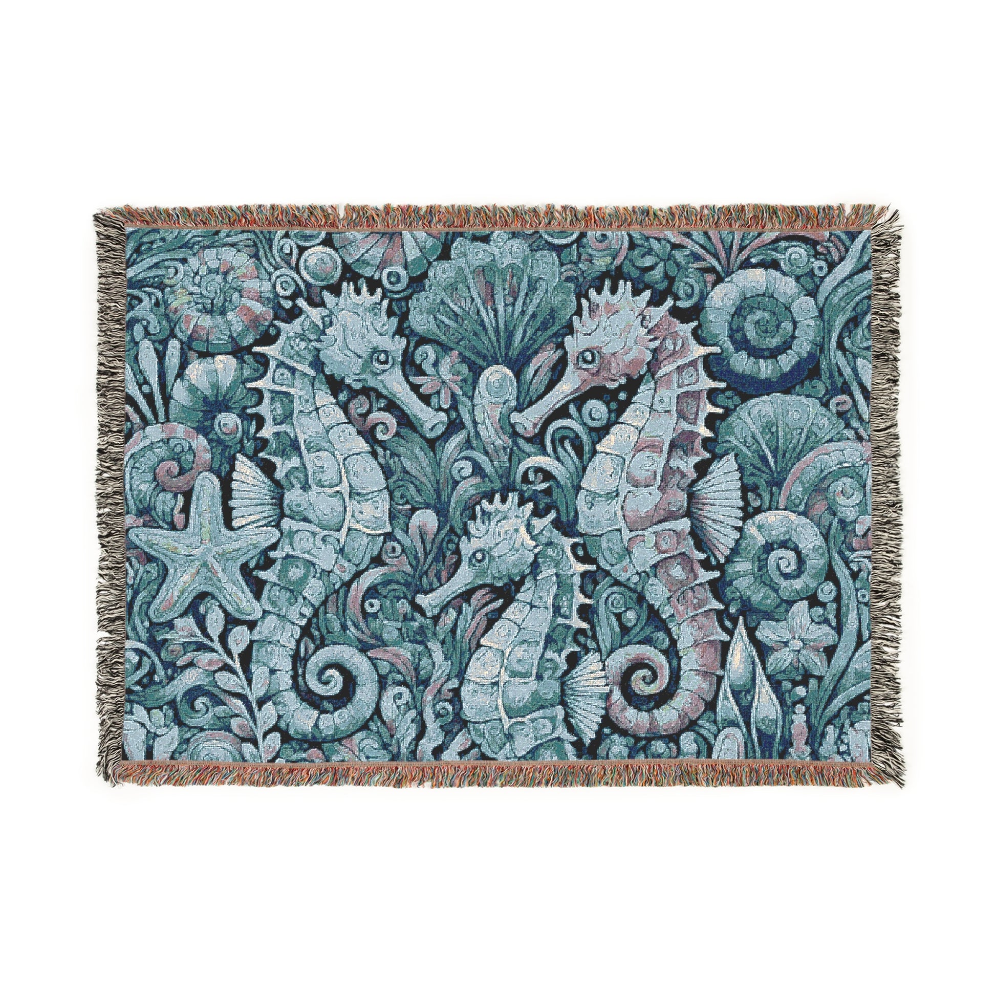Introducing our stunning florala and fauna woven blanket, with tropical vibes, designed to add warmth and charm to any space with design of a trio of gorgeous seahorses for tropical homes. This blanket exudes a cozy, inviting atmosphere, making it perfect for snuggling up on chilly nights or adding a decorative touch to your living room. Whether draped over a sofa or laid across the foot of your bed, its vibrant patterns and colorful fringed edges bring a delightful energy to your home decor. Ideal for anyone who appreciates craftsmanship and style, this woven blanket makes a thoughtful gift.